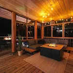 Die Küchenausstattung der Villa Upea Hirsi Moekki Ulkoporeltaalla Sekae Kelosaunalla umfasst einen Wasserkocher, einen Kühlschrank und einen Herd, die in einem Essbereich und einem Essbereich im Freien zur Verfügung stehen.